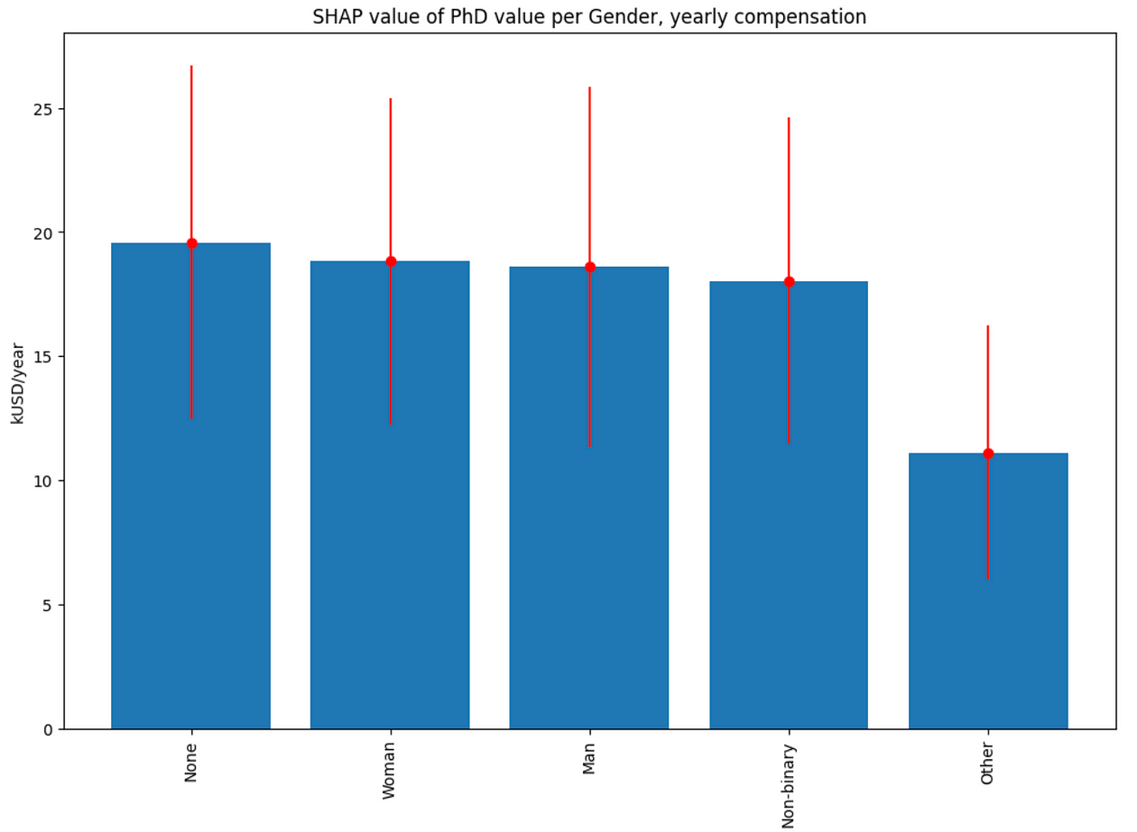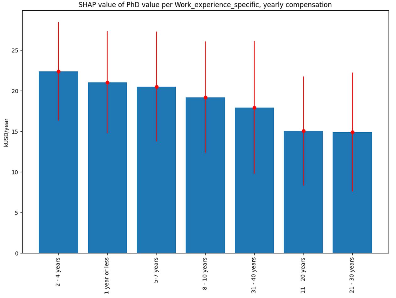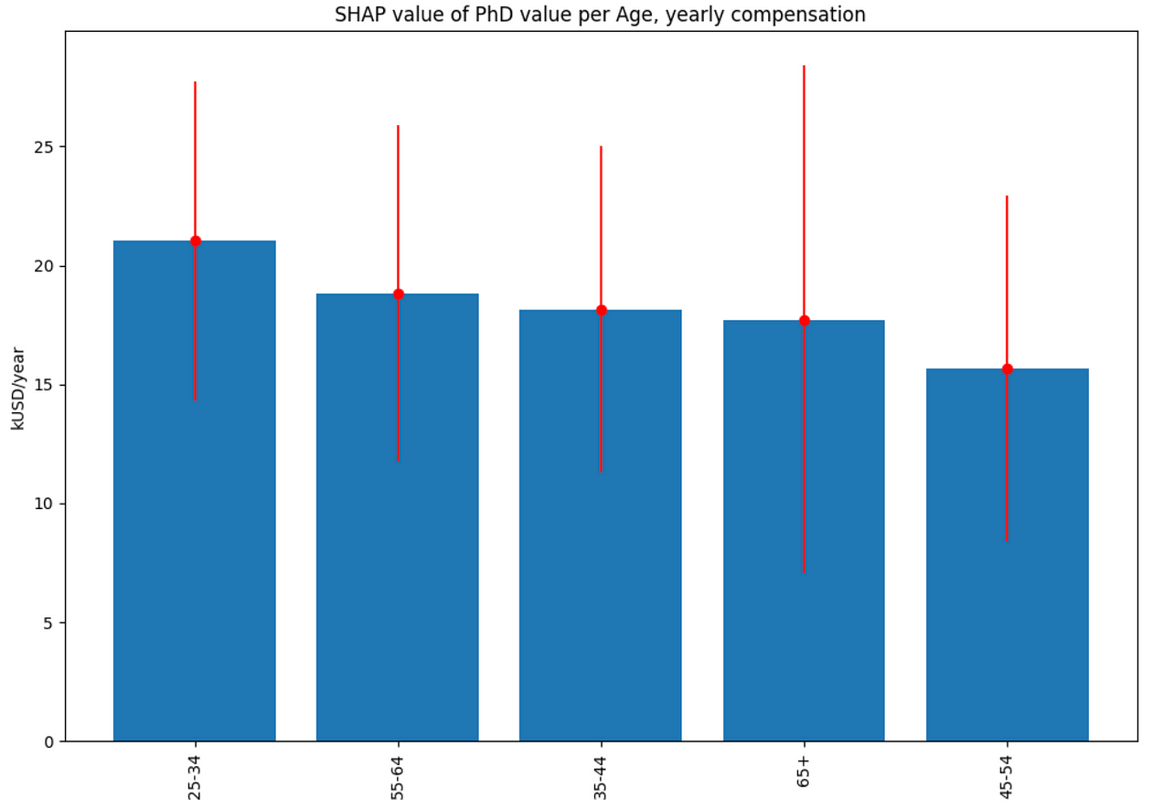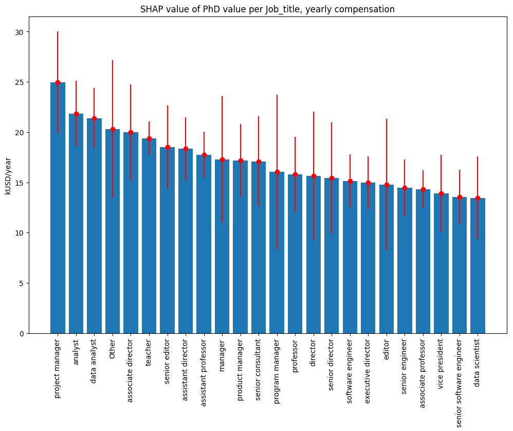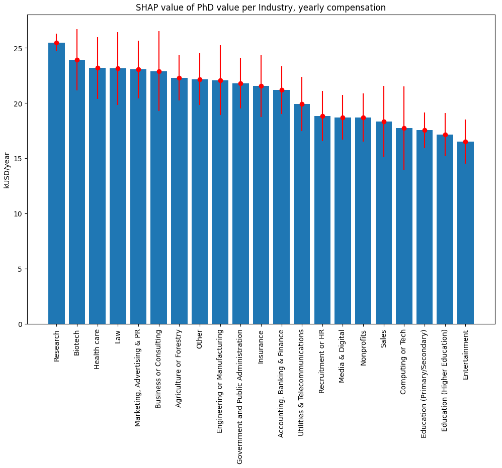 There is also a significant apparent difference in PhD degree value across the industries, with the highest value of about 23 kUSD/year associated with the Research, Biotech, and Health care industries: