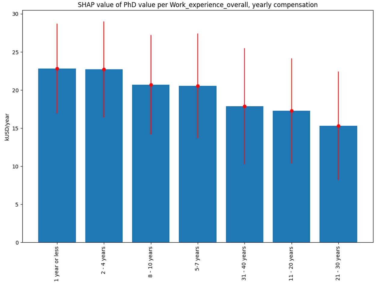 Regarding overall work experience, not surprisingly, the largest PhD value is associated with the least experienced responders: